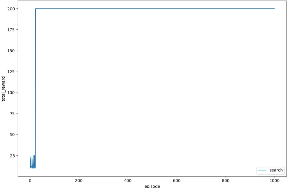 # Average total reward over 1000 episode: 199.98可以看到在测试阶段的平均总奖励接近 200,即 CartPole 环境中可以获得的最高奖励。通过多次运行评估,可以获得非常一致的结果。