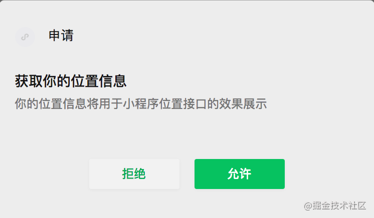 加上这一字段,当小程序用到定位系统时,发现小程序的权限没给到就会让用户将权限给到小程序,效果如下: