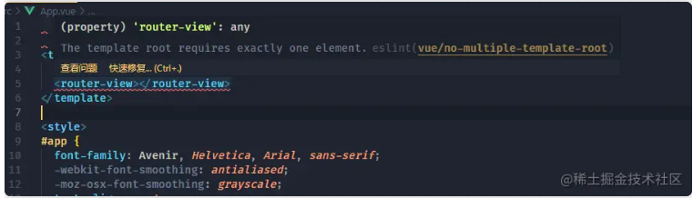 如下报错,在app.vue可以看到,这里提示需要一个根元素,实际上vue3已经不需要写一个根元素了。