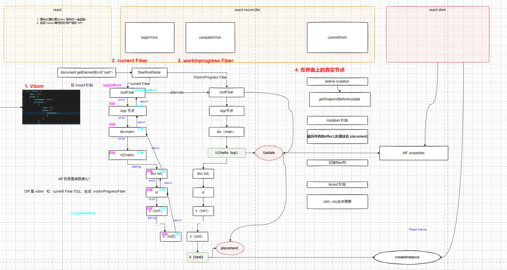beginWork和completeWork阶段会循环最新的jsx生成的虚拟dom,通过对比虚拟dom和current Fiber树生成workinProgress Fiber树。