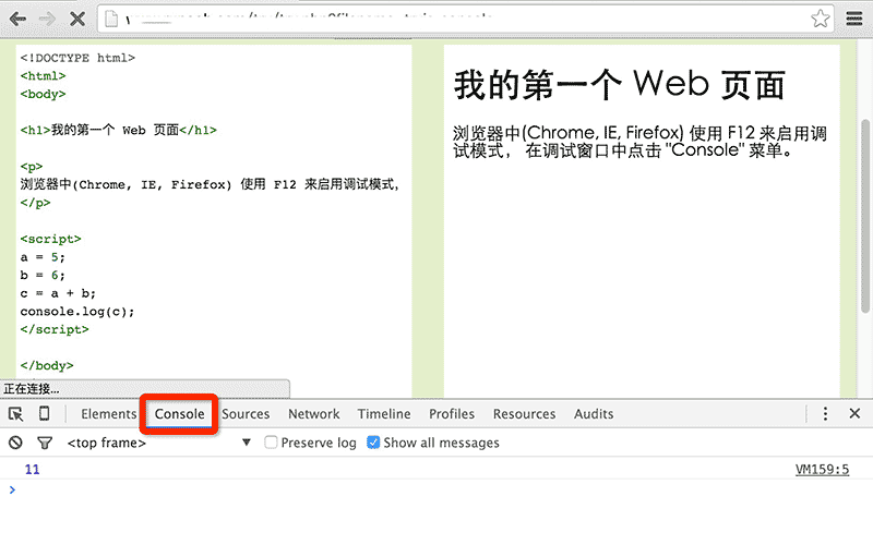 <!DOCTYPE html> <html> <body> <h1>我的第一个 Web 页面</h1> <script> a = 5; b = 6; c = a b; console.log(c); </script> </body> </html>
