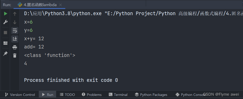 print(add(3, 4))我们看到只有一行表达式,直接运算结果返回值,那这时我们如果使用匿名函数一行代码即可完成