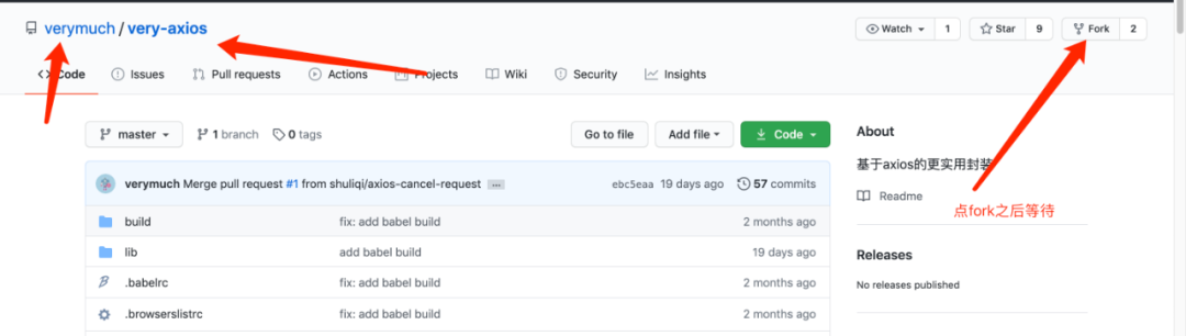 我们采用的第二种方式。我们去 very-axios(https://github.com/verymuch/very-axios) 把代码fork到自己的仓库(如果你还没有自己的github,需要自己注册下哦)。