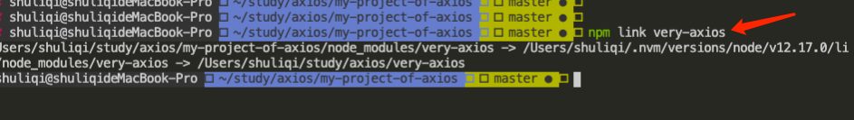 然后我们进入我们my-project-of-axios 目录下面执行npm link very-axios 如图: