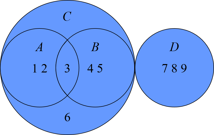 A、B、C 是 C 的子集,C 是 A、B、C 的超集