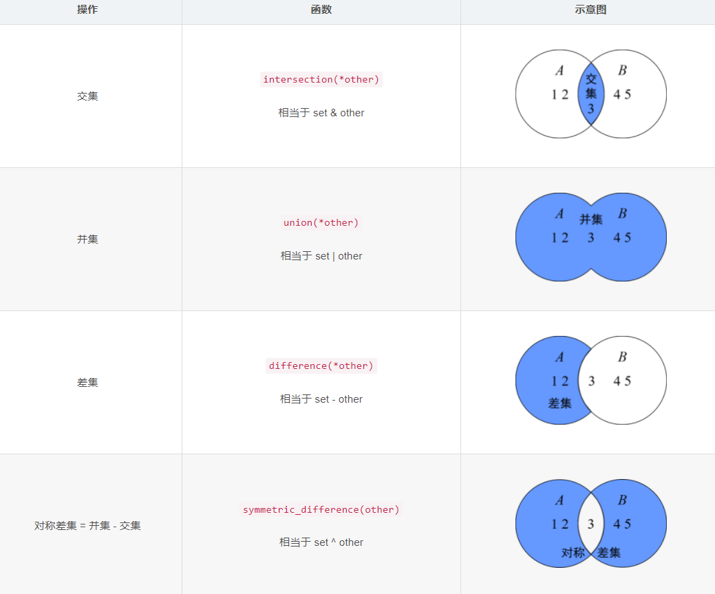 | symmetric_difference_update(other) set ^= other | 移除相同元素 |