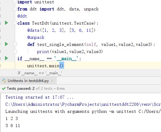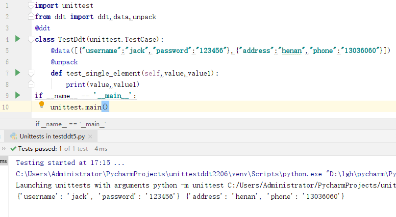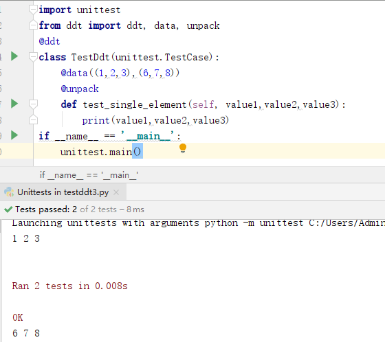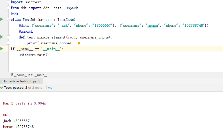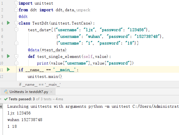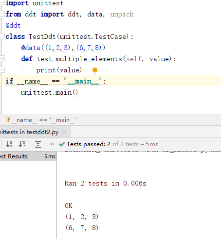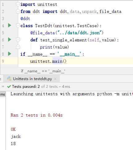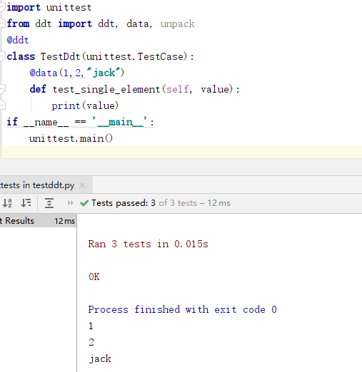 代码中@data(1,2,“jack”)传入了三个元素,故ddt自动生成了3个测试用用例。分别打印传入的数据