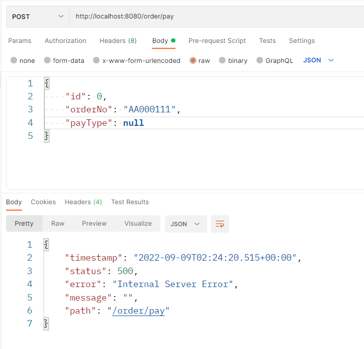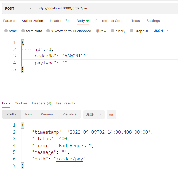 2022-09-10 10:14:30.406 WARN 128760 --- [nio-8080-exec-8] .w.s.m.s.DefaultHandlerExceptionResolver : Resolved [org.springframework.http.converter.HttpMessageNotReadableException: JSON parse error: Cannot deserialize value of type `com.example.demo.order.enums.PayTypeEnum` from String "": not one of the values accepted for Enum class: [ALIPAY, BANK_CARD_PAY, WECHAT_PAY]; nested exception is com.fasterxml.jackson.databind.exc.InvalidFormatException: Cannot deserialize value of type `com.example.demo.order.enums.PayTypeEnum` from String "": not one of the values accepted for Enum class: [ALIPAY, BANK_CARD_PAY, WECHAT_PAY]