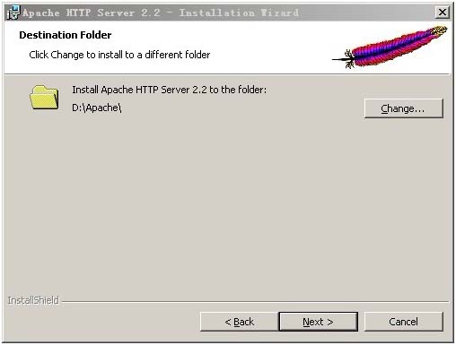 点击“Change...”,手动指定安装目录。这里我们把Apache安装到了“D:\Apache\”,安装哪里你自己决定。建议不要安装在操作系统所在盘(通常是C盘),免得操作系统坏了之后,还原操作把Apache配置文件也清除了。指定好安装目录后,点“Next”继续。
