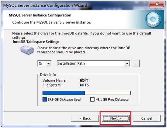 在出现的界面中,进行对InnoDB Tablespace进行配置,就是为InnoDB 数据库文件选择一个存储空间,如果修改了,要记住位置,重装的时候要选择一样的地方,否则可能会造成数据库损坏,当然,对数据库做个备份就没问题了,如图所示: