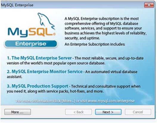 MySQL数据库的安装十分简单,关键是安装完成之后的配置,单击完成之后出现如下的配置界面向导,单击“next”进行配置,如图所示: