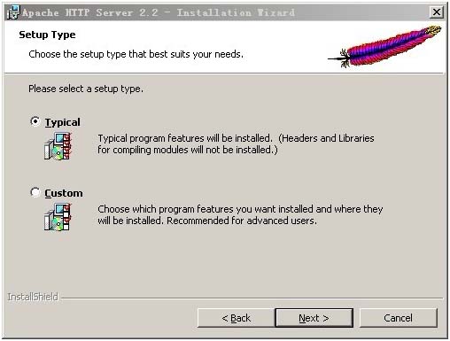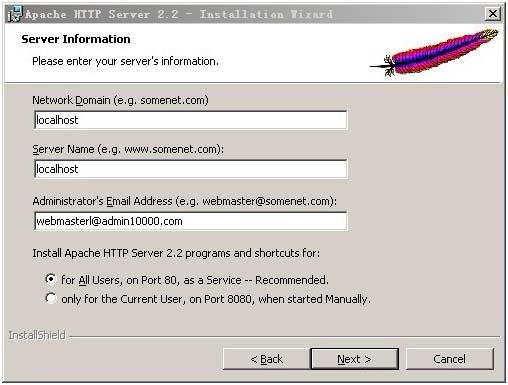 提示:因为我们安装apache主要是在本机上做开发,所以前2项填写localhost即可。以上3项信息可以任意填写,以后可以在httpd.conf文件中修改这些信息。