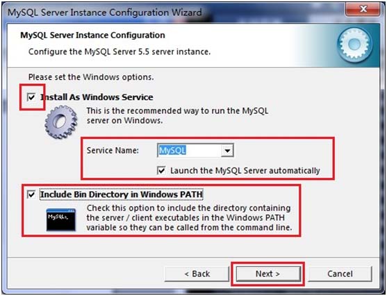 在打开的页面中选择是否将mysql安装为windows服务,还可以指定Service Name(服务标识名称),是否将mysql的bin目录加入到Windows PATH(加入后,就可以直接使用bin下的文件,而不用指出目录名,比如连接,“mysql–u username –p password;”就可以了,单击“next”继续配置,如图所示: