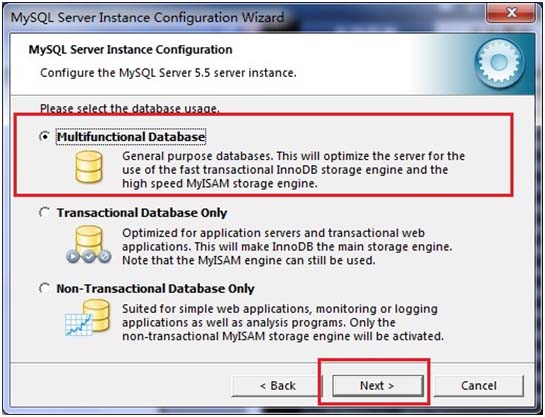 在出现的配置界面中选择mysql数据库的用途,“Multifunctional Database(通用多功能型)”、“Transactional Database Only(服务器类型)”、“Non-Transactional Database Only(非事务处理型)”,这里我选择的是第一项, 通用安装,单击“next”继续配置,如图所示: