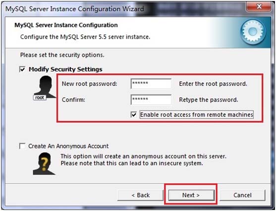 在打开的页面中设置是否要修改默认root用户(超级管理员)的密码(默认为空),“New root password”,如果要修改,就在此填入新密码,并启用root远程访问的功能,不要创建匿名用户,单击“next”继续配置,如图所示: