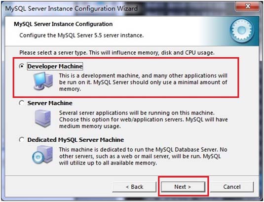在出现的窗口中,选择服务器的类型,“Developer Machine(开发测试类)”、“Server Machine(服务器类型)”、“Dedicated MySQL Server Machine(专门的数据库服务器)”,我们仅仅是用来学习和测试,默认就行,单击“next”继续,如图所示: