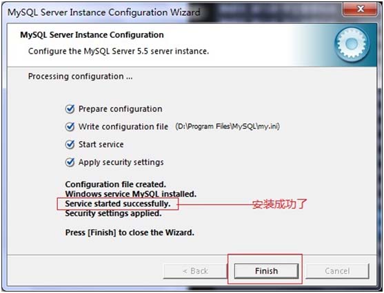 过了几分钟,出现如下的提示界面就代表MySQL配置已经结束了,并提示了成功的信息。