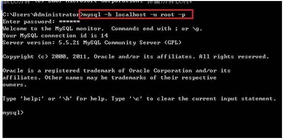 在服务中将mysql数据库启动,并在命令窗口中输入“mysql –h localhost –u root -p”或者是“mysql -h localhost -uroot -p密码”,接着在出现的提示中输入用户的密码,如图所示: