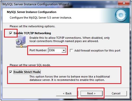 Mysql默认情况下启动TCP/IP网络,端口号为3306,如果不想使用这个端口号,也可以通过下拉列表框更改,但必须保证端口号没有被占用。Add filewall exception for this Port 复选框用来在防火墙上注册这个端口号,在这里选择该选项,Enable Strict Mode 复选框用来启动MYSQL标准模式,这样MYSQL就会对输入的数据进行严格的检查,不允许出现微小的语法错误,对于初学者来说不建议选择该项,以免带来麻烦,我这里是给勾选上了,可以不选择该选项,单击“next”继续,如图所示: