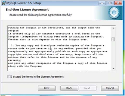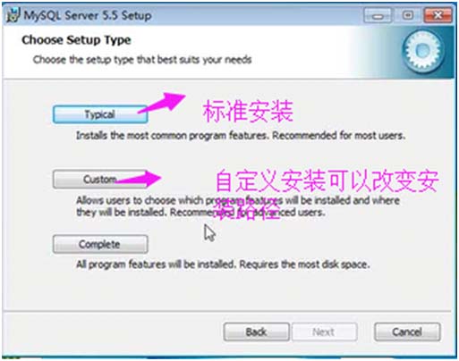 选择“I accept the terms in the license agreement”同意授权协议,然后点“Next”继续,在出现选择安装类型的窗口中,有“typical(默认)”、“Complete(完全)”、“Custom(用户自定义)”三个选项,我们选择“Custom”,因为通过自定义可以更加的让我们去熟悉它的安装过程,对于学习MySQL数据库很有帮助,单击“next”继续安装,如图所示: