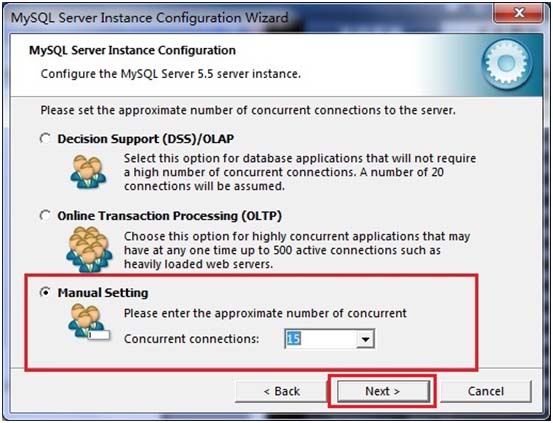 在打开的页面中,选择mysql的访问量,同时连接的数目,“Decision Support(DSS)/OLAP(20个左右)”、“Online Transaction Processing(OLTP)(500个左右)”、“Manual Setting(手动设置,设置为15个)这里选择手动设置,单击“next”继续,如图所示: