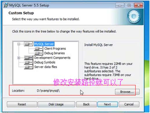 在出现自定义安装界面中选择mysql数据库的安装路径,这里我设置的是“d:\Program File\MySQL”,单击“next”继续安装,如图所示: