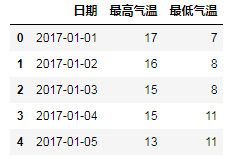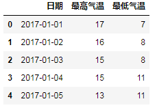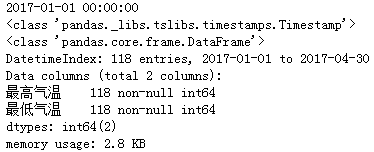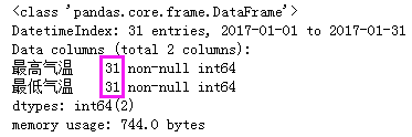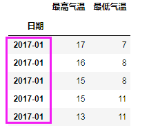 # 提取1月份的温度数据 df_jan = df[(df.index >= "2017-1-1") & (df.index < "2017-2-1")] # 或用这种方式也可以 df_jan = df["2017-1-1":"2017-1-31"] # print(df_jan.info())