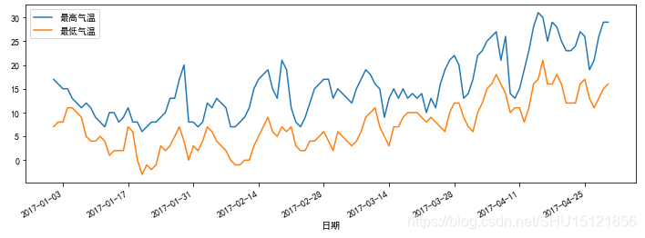 # 绘制[最高温度]和[最低温度]两个指标随着索引[时间]变化的图 fig, ax = plt.subplots(1, 1, figsize=(12, 4)) df.plot(ax=ax) plt.show()