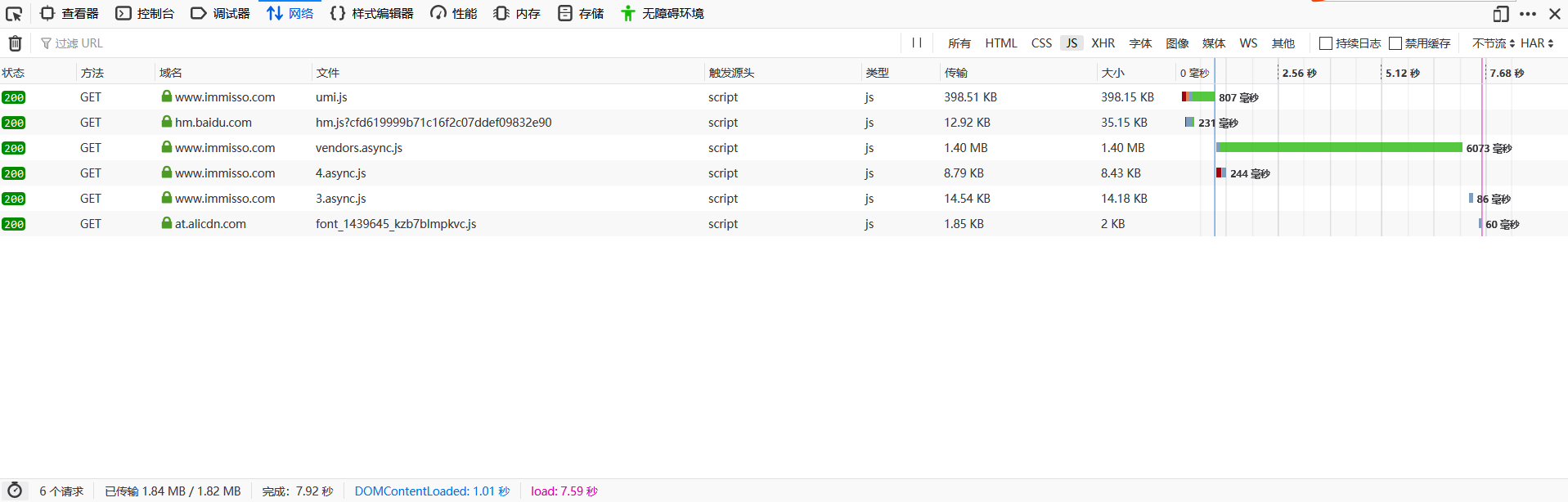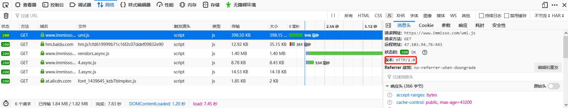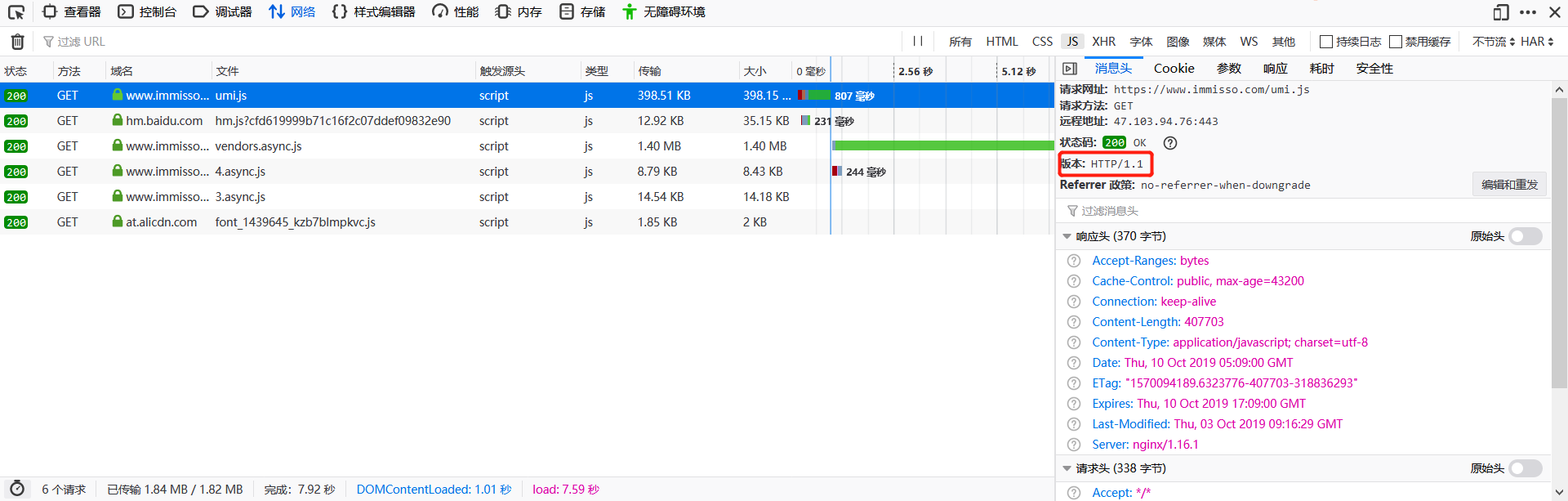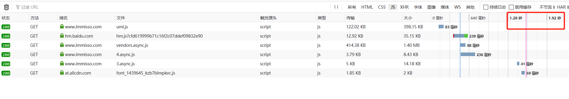 从图中可以看出,大大的提升了速度。再观察传输和大小这一栏,两者大小差异就很大了。完成了这两步,速度已经从以前的6s减少到2秒左右了。