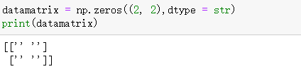 # 生成一个2×2的类型为str的矩阵 import numpy as np datamatrix = np.zeros((2, 2),dtype = str) print(datamatrix)