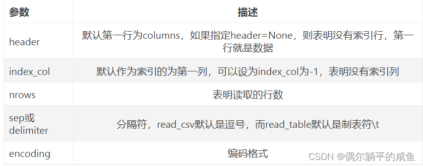 读取文件生成DataFrame最常用的是read_csv,read_table方法。该方法中几个重要的参数如下所示: