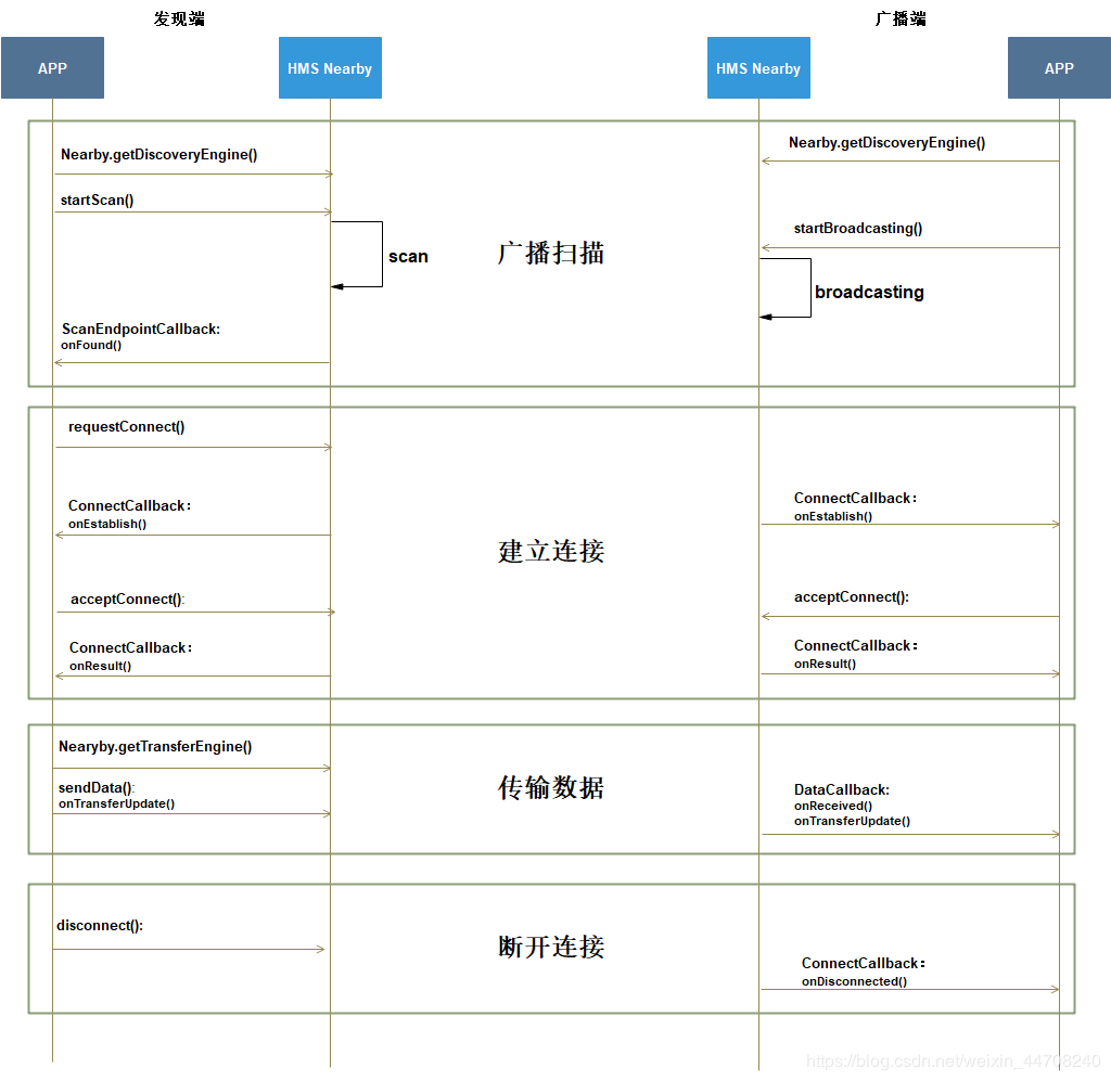 广播扫描阶段:广播端启动广播,发现端启动扫描以发现广播端。