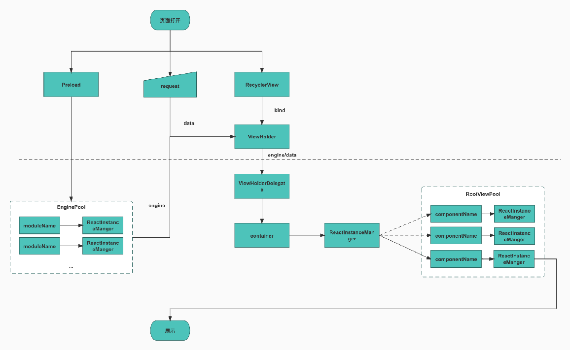 - 由于 RN 需要将离线包加载后才能执行 JS 生成客户端视图,在 RecyclerView 绑定数据时才开始加载 RN 的离线包势必会拖慢整个模块的展示,所以这里我们做了整个离线包的预加载