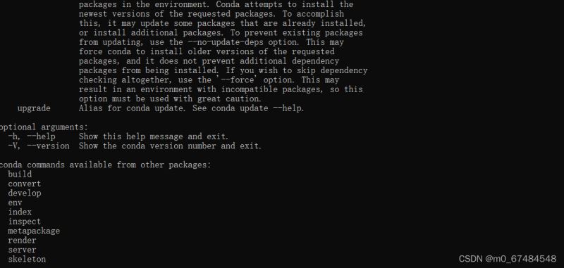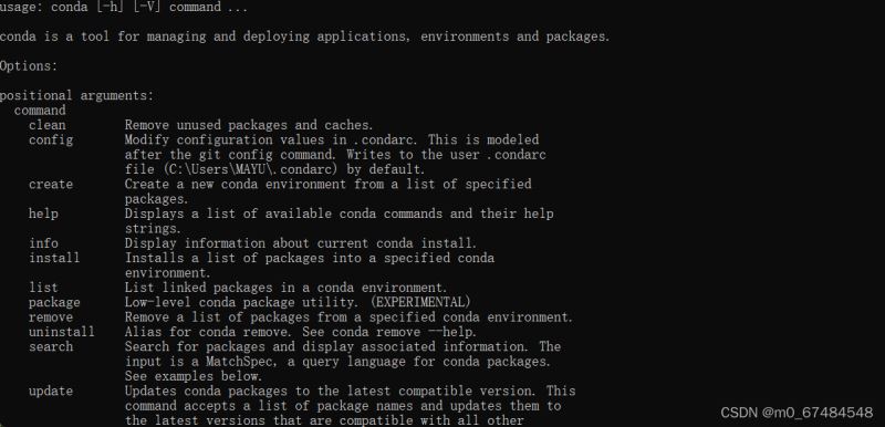 最后,启动运行命令框,输入conda,如果结果显示如下图所示,说明Anaconda 的环境变量配置成功