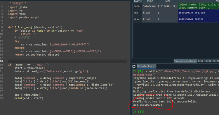 小数据集(先试过了1w)可能多进程还没单进程快,因为进程开启关闭也要一点时间。于是我弄了 100w 数据来测试: