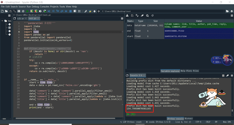 可以看到改写后时间用时 154s(2min30s),比单进程快了一倍。关于 pandarallel 可以查看文档