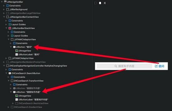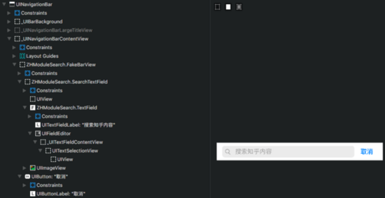 图中可以清楚看到知乎首页导航栏由2个button组成,搜索页面使用了textField,这类似上文提到的第三种思路。
