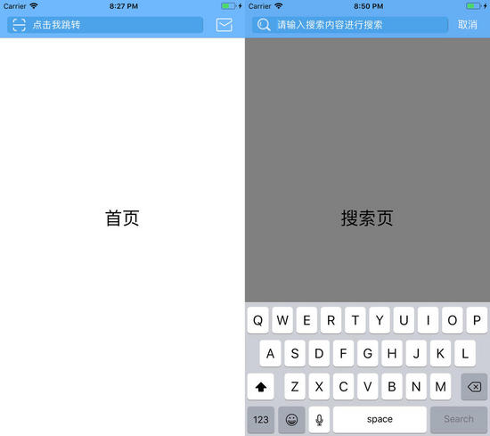 这时候问题又出现了,点击搜索页面的取消按钮,没有跳回首页而是还在这个页面。但是可以看到屏幕的闪动。通过打印消息发现,点了取消按钮,执行了首页的- (BOOL)searchBarShouldBeginEditing:(UISearchBar *)searchBar方法。 仔细推敲之后想明白了原因是没有取消第一响应者,加上导航栏的交互机制,pop到上个页面的时候并不会进行页面刷新导致了这个问题。 解决办法在首页要push搜索页面的时候取消第一响应者