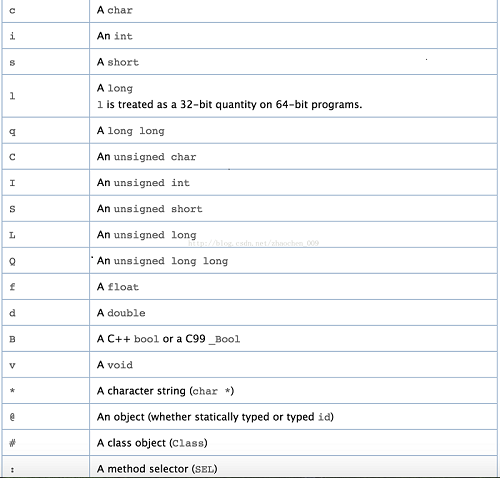 首先,先要了解的是,每个方法都有self和_cmd两个默认的隐藏参数,self即接收消息的对象本身,_cmd即是selector选择器,所以,描述的大概格式是:返回值@:参数。@即为self,:对应_cmd(selector).返回值和参数根据不同函数定义做具体调整。