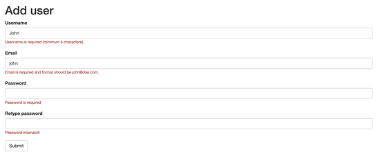 <!-- app.component.html --> ... <div> <label>Password</label> <input type="password" name="password" [ngModel]="user.password" required #password="ngModel"> <small [hidden]="password.valid || (password.pristine && !f.submitted)"> Password is required </small> </div> <div> <label>Retype password</label> <input type="password" name="confirmPassword" [ngModel]="user.confirmPassword" required validateEqual="password" #confirmPassword="ngModel"> <small [hidden]="confirmPassword.valid || (confirmPassword.pristine && !f.submitted)"> Password mismatch </small> </div> ...