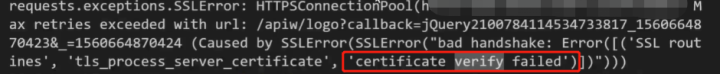 HTTPS是兼容HTTP的,可以把HTTPS理解为'HTTP over TSL',即HTTPS是HTTP协议和TSL协议的组合。HTTPS在传输数据时,同样会先建立TCP连接,建立起TCP连接后,会建立TSL连接。请求可以为HTTPS请求验证SSL证书,就像我们使用的浏览器一样,SSL验证默认是开启的,如果证书验证失败,请求会抛出一个SSLError,如下图: