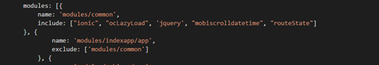 应对:将第三方库/公共服务和指令分别压缩为三个模块,然后每个模块的打包脚本中使用” exclude”将其移除.如下图所示: