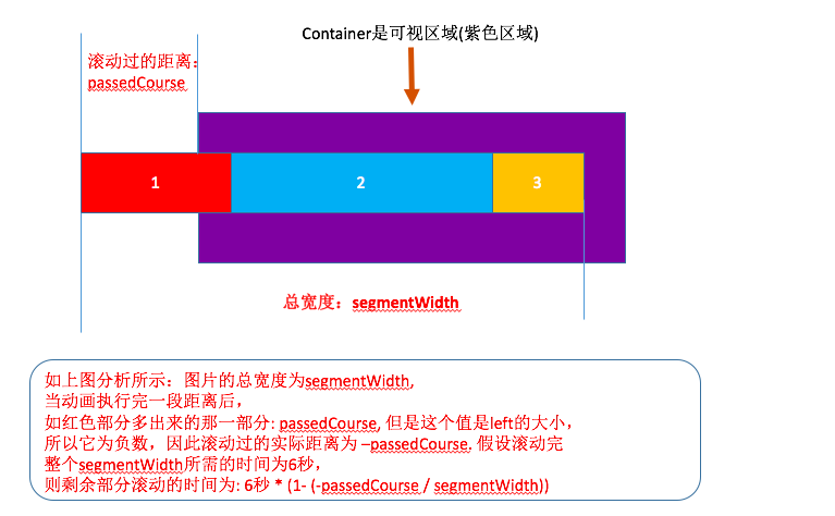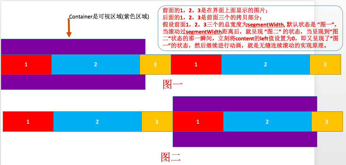 3. 设置6秒钟滚动完界面上面现有的图片,滚动完毕后,通过设置content的left值,将其整体拉回到初始状态,原理分析图的"图二"所示。然后递归调用run方法,完成无限滚动。