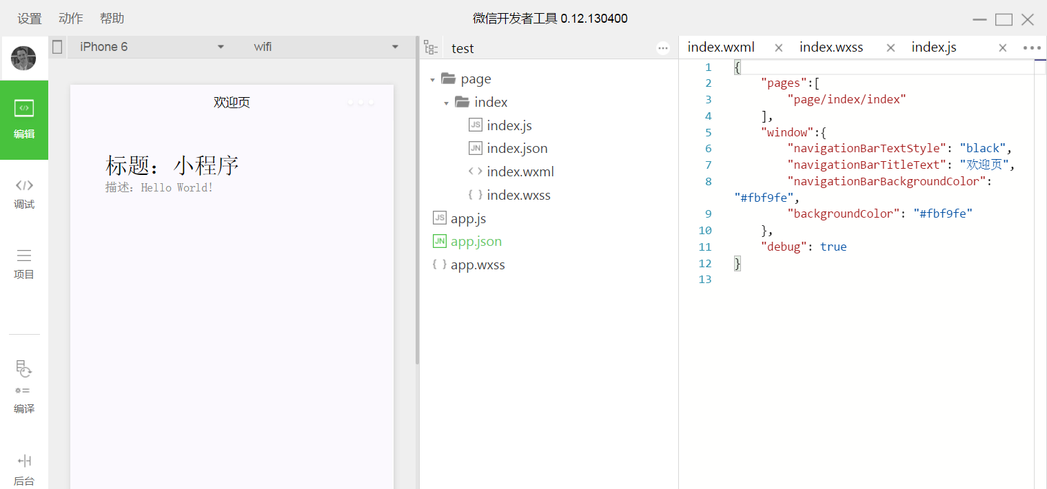 3、如果出现如下效果,那么恭喜你,你的第一个小程序项目已经编写成功了!点击左侧边栏“编辑”,还可以在右侧编辑窗口直接对代码进行修改,保存(CTRL S)后刷新(F5)即可生效。