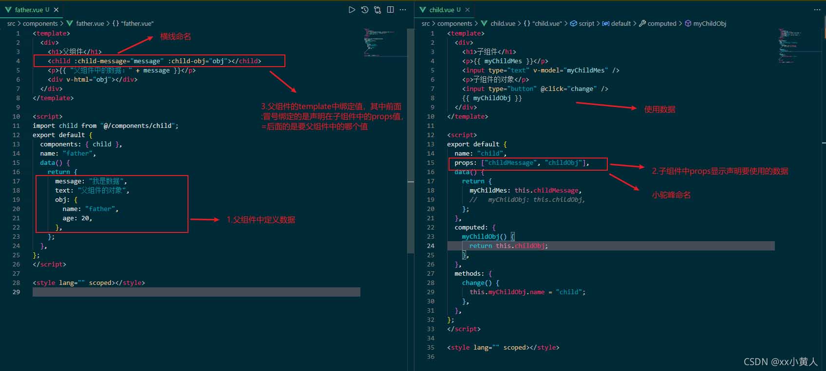 第二点,但是基本数据类型时,子组件接收了父组件中的数据再进行修改,父组件中的数据是不受影响的,也就是props的单向数据流;但是如果是对象数组这种引用类型数据的话,子组件中修改,父组件也会跟着变化的(当然,父组件中修改子组件也会变化),原因就是它们共用一个内存地址,相当于浅拷贝!