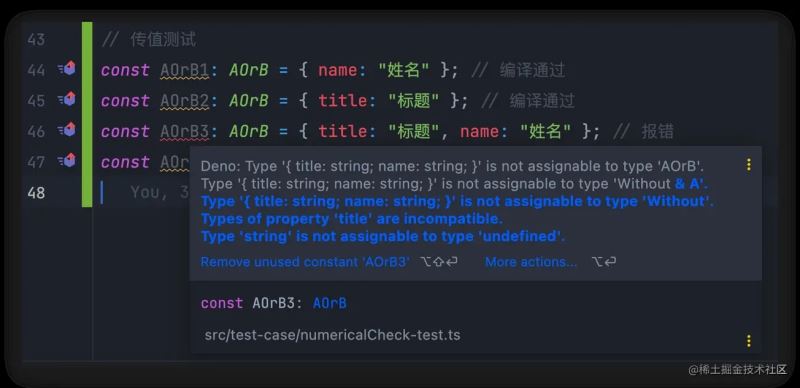 const AOrB4: AOrB = { name: "姓名", otherKey: "" }; // 报错:Type '{ name: string; otherKey: string; }' is not assignable to type 'AOrB'.当两个属性同时出现时,编辑器直接就抛出了类型错误(我们把排除后的所有属性的类型设为了never,因此当你给其赋任何值时它都会报类型错误),如下图所示: