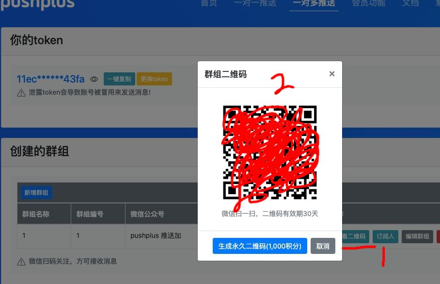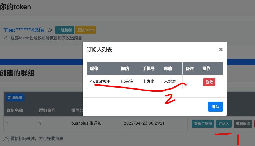 3、扫码后,看看订阅人,扫码之后的人,会显示在这里。给这个群组发送的消息,这里的人都会接收到。