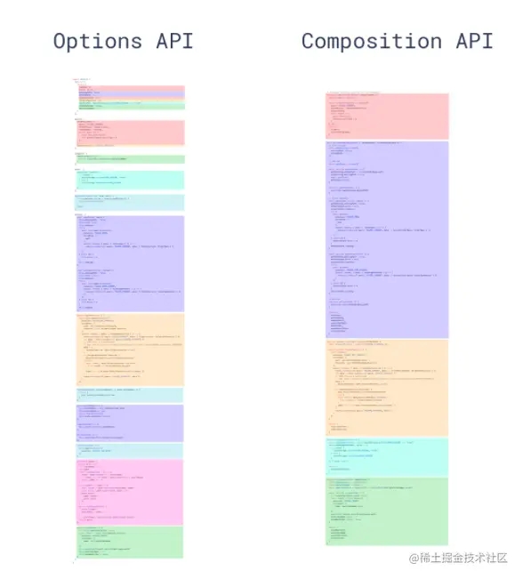 下图展示了vue2写法和vue3 hooks写法的区别。图中相同颜色的代码块代表这些代码是属于同一个功能的,但vue2的写法导致本来是相同功能的代码,却被拆散到了不同地方(react其实也容易有相同的问题,例如当一个组件有多个功能时,不同功能的代码也很容易混杂到一起)。而通过封装成一个个hooks,相关联的代码就很容易被聚合到了一起,且和其他功能区分开了。