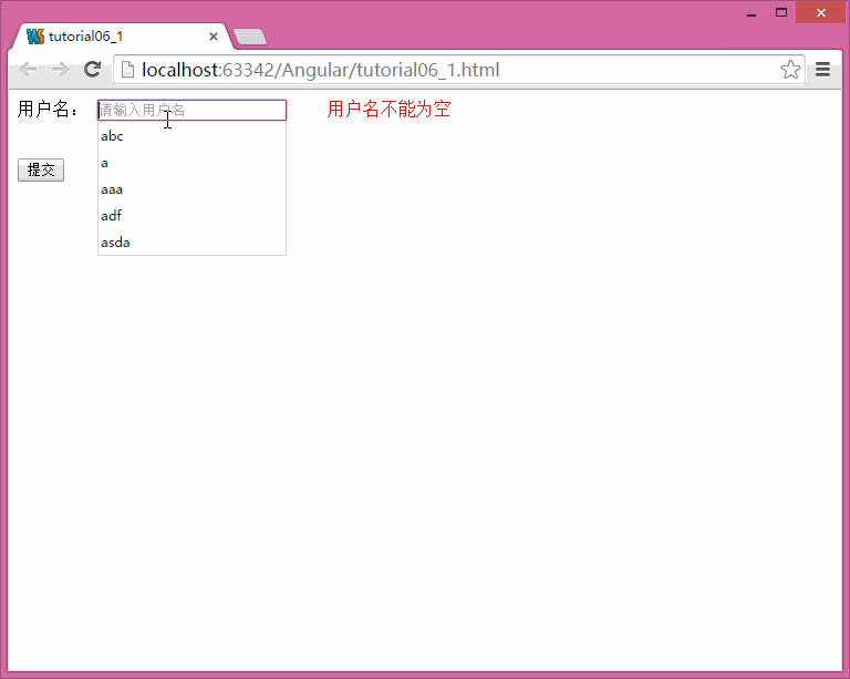 required指定文本框为必输项,ng-minlength指定最小长度,ng-maxlength指定最大长度,校验工作是AngularJs内部完成的,我们只需要定义不满足条件时的提示信息: