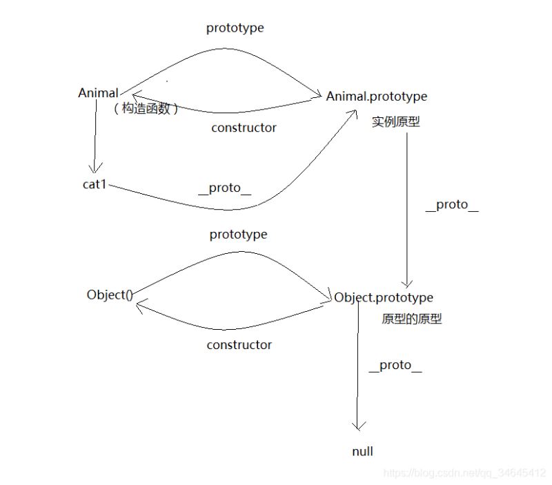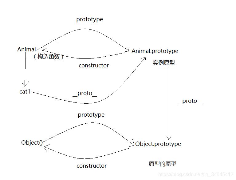 那么cat1.constructor === Animal为true 吗?答案是true,因为每一个对象都会从原型中“继承”属性,cat1中并没有属性constructor ,但是它的原型cat1.__proto__ 指向的是Animal.prototype,然而Animal.prototype原型中是有属性constructor的,于是cat1的constructor属性继承与原型中的constructor属性。这里便能看出一点点原型链的影子了,我们接着看
